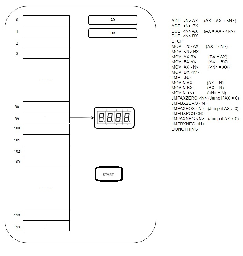Вычислительное устройство (далее ВУ) состоит из 200 ячеек памяти и двух регистров AX и BX. В ячейки памяти можно записывать команды и числа. В регистры можно записывать только числа. Примеры команд показаны справа на картинке (о командах будет далее).